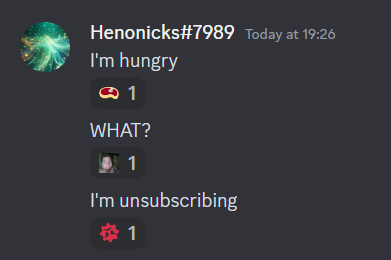 Second - Reacting to messages. Sometimes there's something so interesting in the chat that we want to react to it. While we see the emoji we react with, for bots, it's some plain text. There are different formats for different kinds of emoji when reacting too. For unicode, it's simply its character, like when sending. For custom ones it's either [name]:[id] (if static) or a:[name]:[id] (if animated). Let's show our bot's honest reactions!