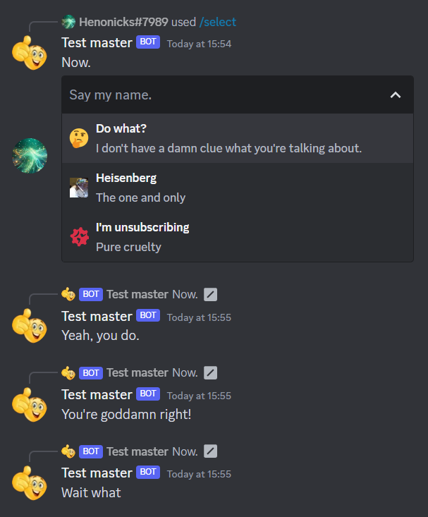 .add_select_option(dpp::select_option("Heisenberg", "You're goddamn right!", "The one and only").set_emoji(walter.name, walter.id))